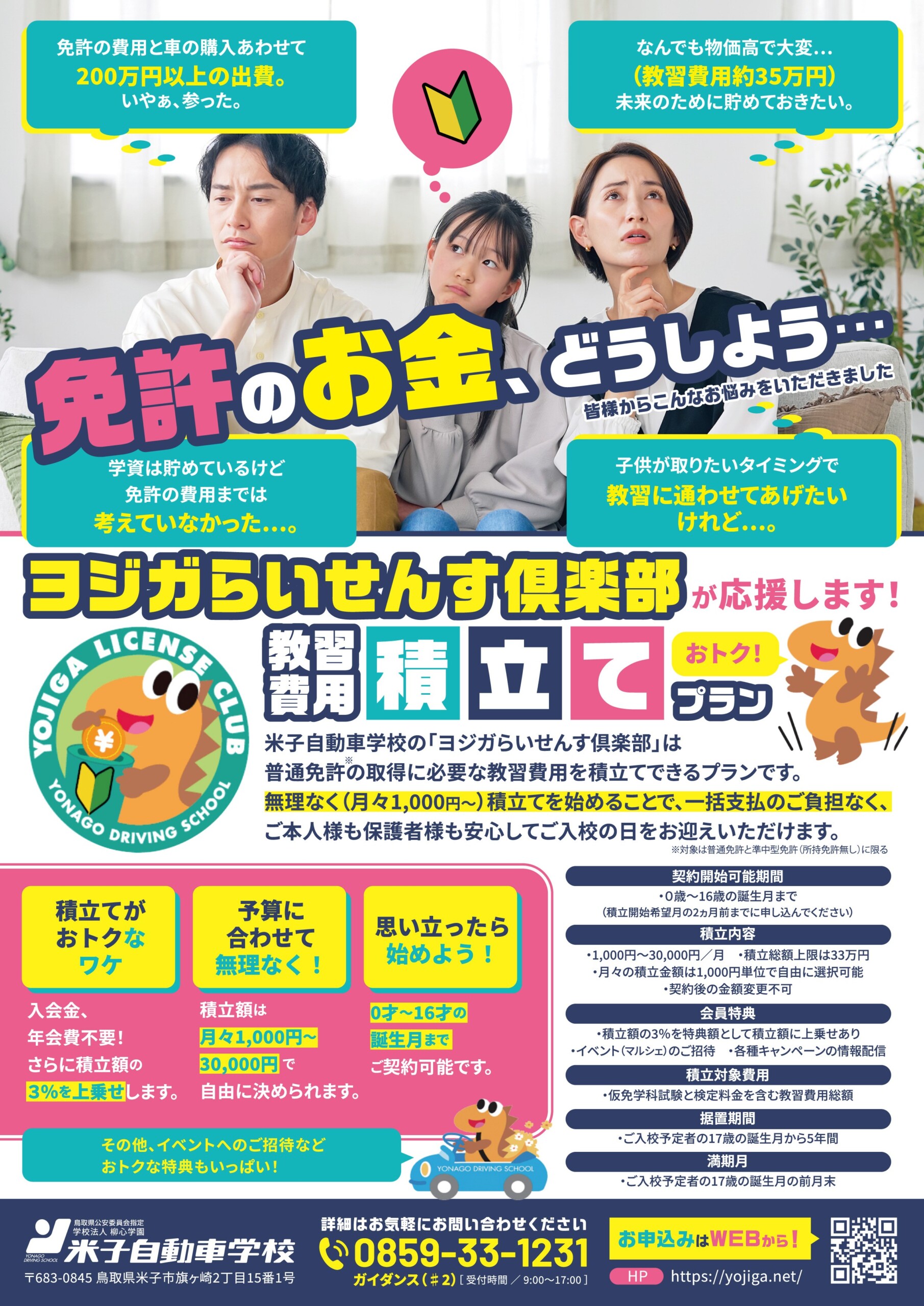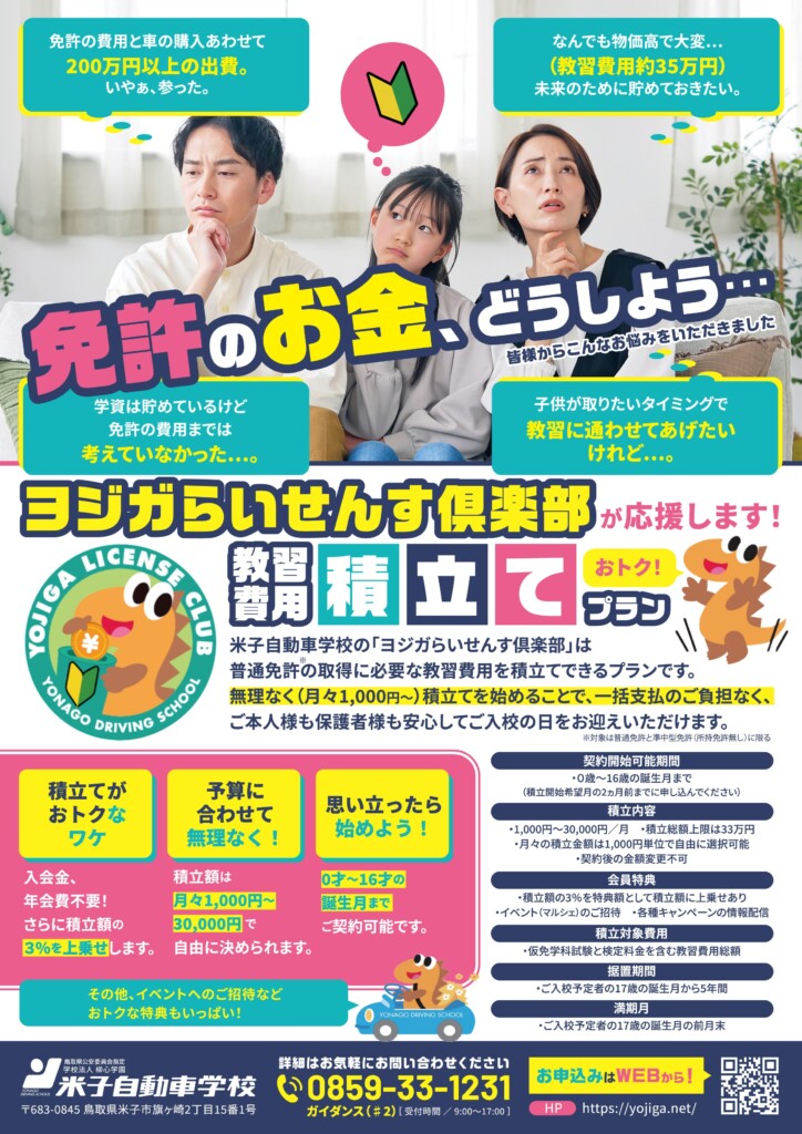 2025.10.18 お知らせ 教習費用積立プラン「ヨジガらいせんす倶楽部」がリニューアルして再開いたします! この度、米子自動車学校の教習費用積立プラン「ヨジガらいせんす倶楽部」がリニューアルをして再開することとなりました! 2025年11月11日(火)よりWEB申込ページを公開いたします! お申し込み受付開始まで、今しばらくお待ちください。 前の記事 お知らせ一覧 次の記事